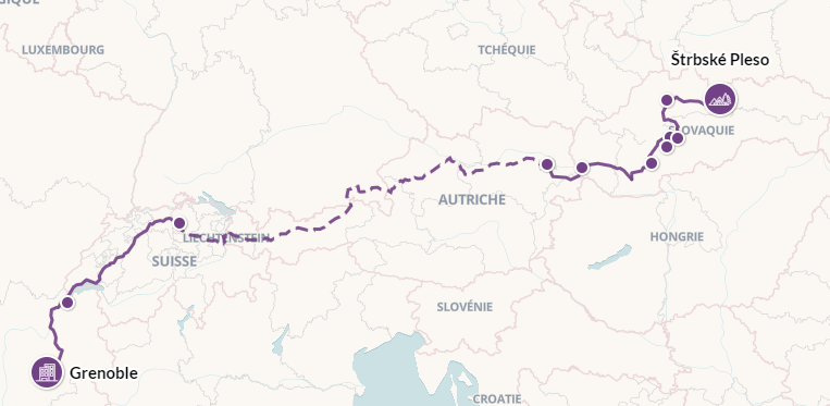 Avec un peu de patience, le trajet se fait sans problème particulier : la Slovaquie est à deux pas de Vienne, elle-même accessible en train de nuit (trajet en pointillés sur la carte ci-dessous). En partant de Grenoble à 11h58 samedi, on arrive sans encombres en Slovaquie le dimanche pour le petit déj.