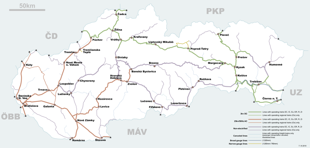 En prenant la carte des chemins de fer slovaques, nous pouvons également voir que les lignes non electrifiés (et donc Diesel), sont des lignes loin des grandes villes.
